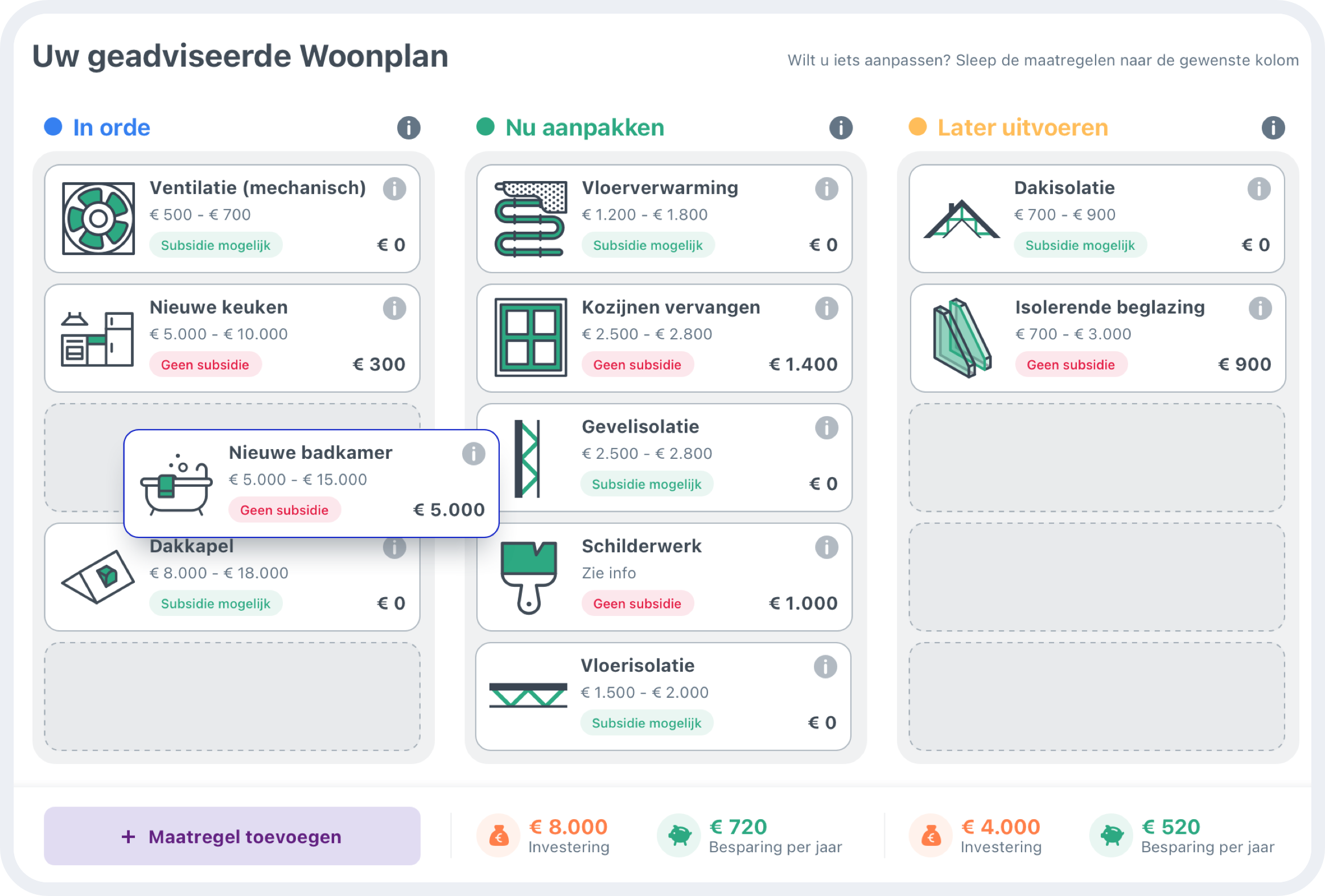 De bestaande tool en de nieuwe module zijn nu samengevoegd tot een helder te gebruiken stappenplan met een eenduidige online uitstraling. Het is op deze manier laagdrempelig om de juiste gegevens van je huis in te vullen en zo aan het eind de juiste berekening te zien van de kosten. Met als doel verduurzamen en besparen!