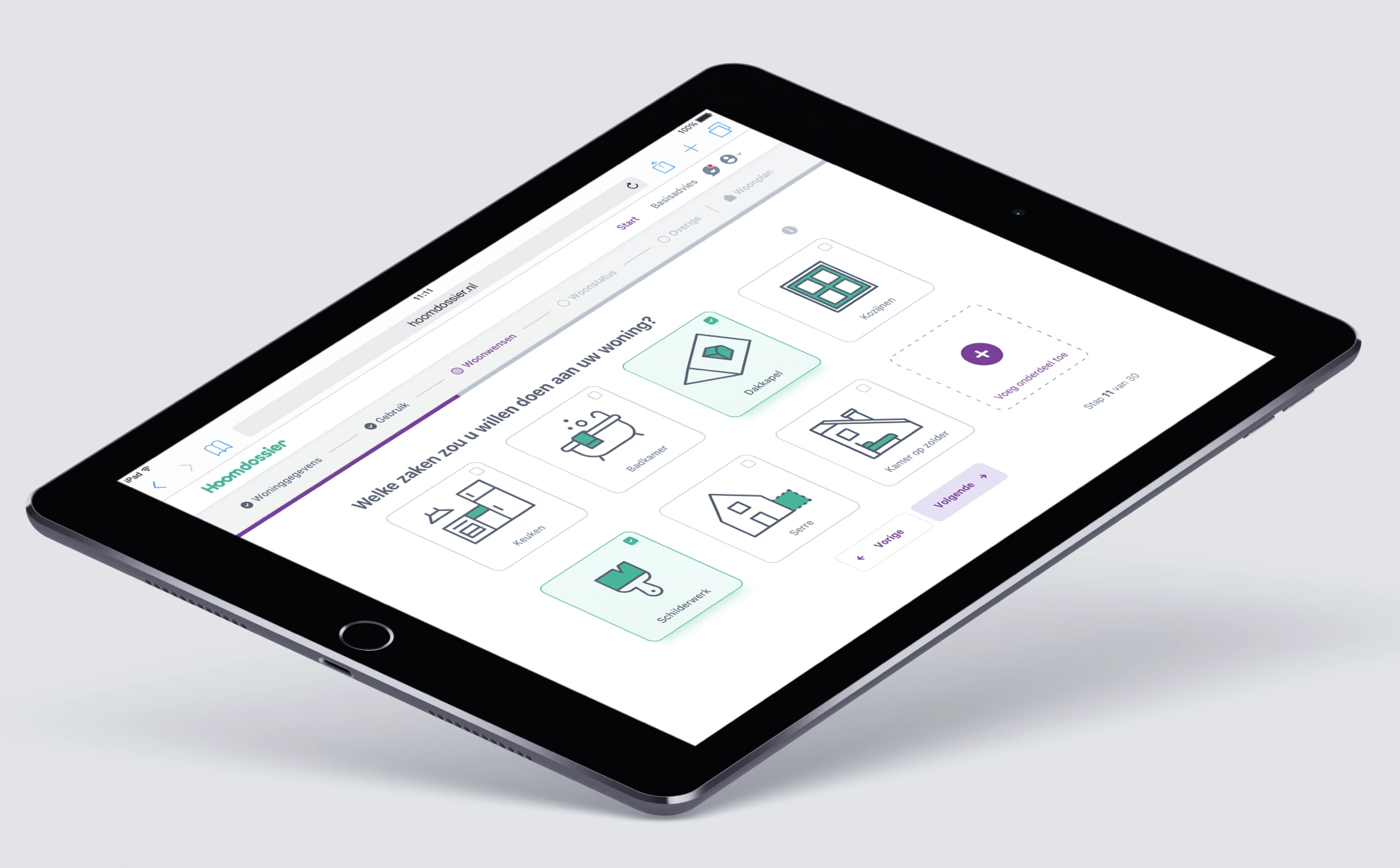 De tool wordt veelal gebruikt op een iPad en wordt dus met de hand bediend. Daardoor kwamen we er snel op uit om een stappenplan te maken waar eenvoudig doorheen te navigeren is. Duidelijke knoppen waarop de gebruiker makkelijk kan tappen aangevuld met native iOS user interface elementen.