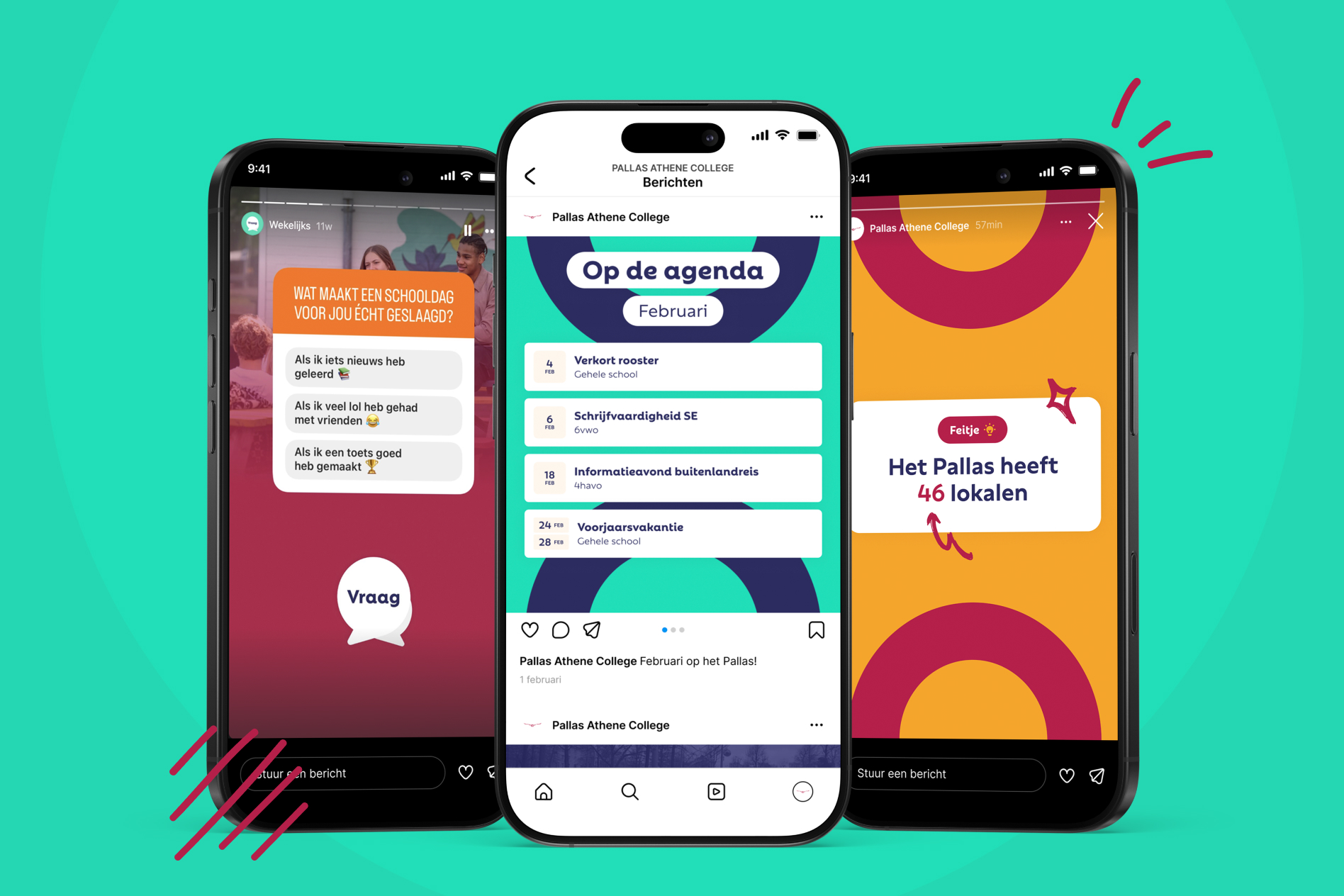Wij verzorgen de creatieve invulling van de social media-uitingen van het Pallas. Denk aan informatieve posts, visueel aantrekkelijke stories en korte reels die inspelen op actualiteit. Alles wordt op maat ontworpen en sluit aan bij de tone of voice en visuele identiteit van de school. Zo brengen we het dagelijks leven op het Pallas op een toegankelijke en herkenbare manier in beeld.